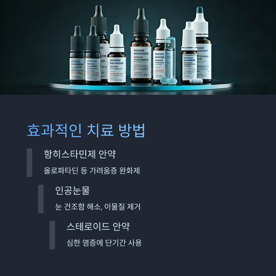 - 약물 치료: 증상 완화를 위한 다양한 안약과 경구약 사용