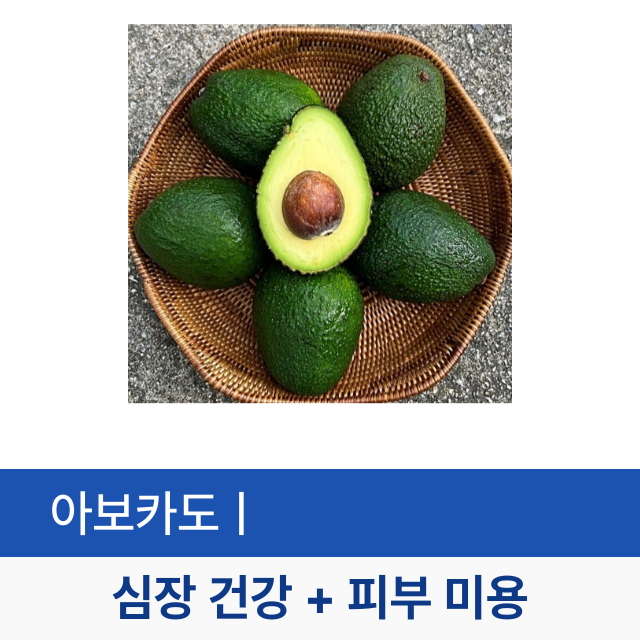 - 효능: '슈퍼푸드'로 불리는 아보카도는 불포화지방산이 풍부해 콜레스테롤 개선과 심장 건강에 좋으며, 피부 미용에도 탁월합니다.